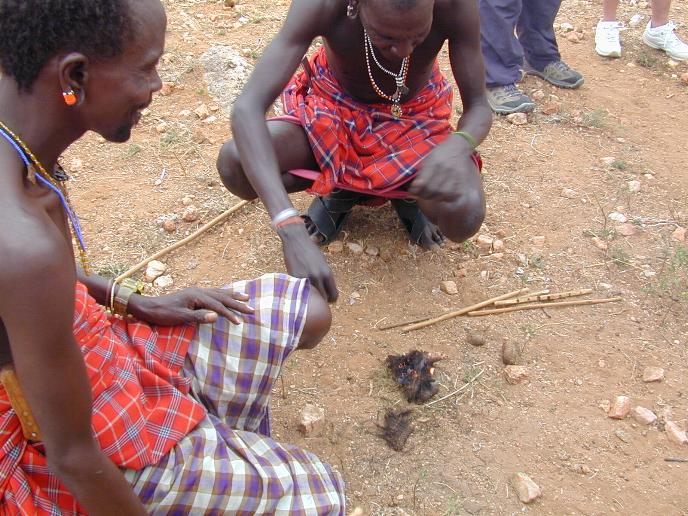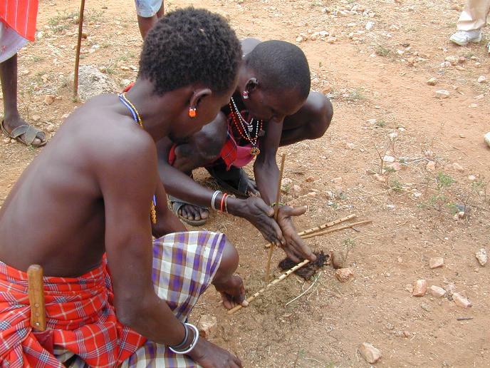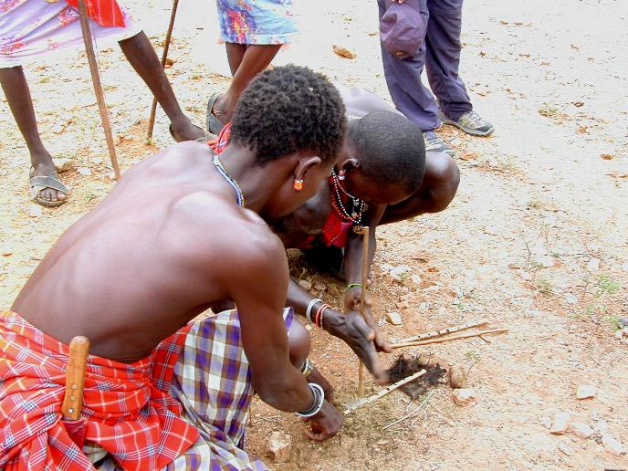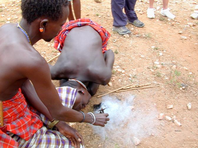 The Samburu men are good at starting fires with sticks, cow dung and wood shavings and some elbow grease. Smoke appears quickly and then fire.