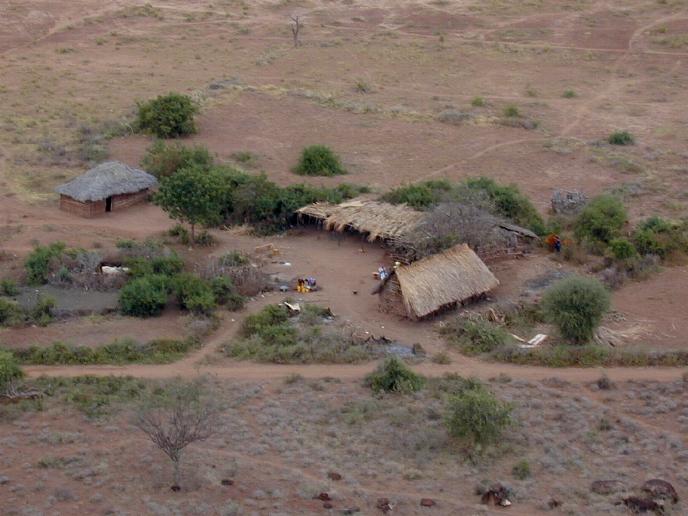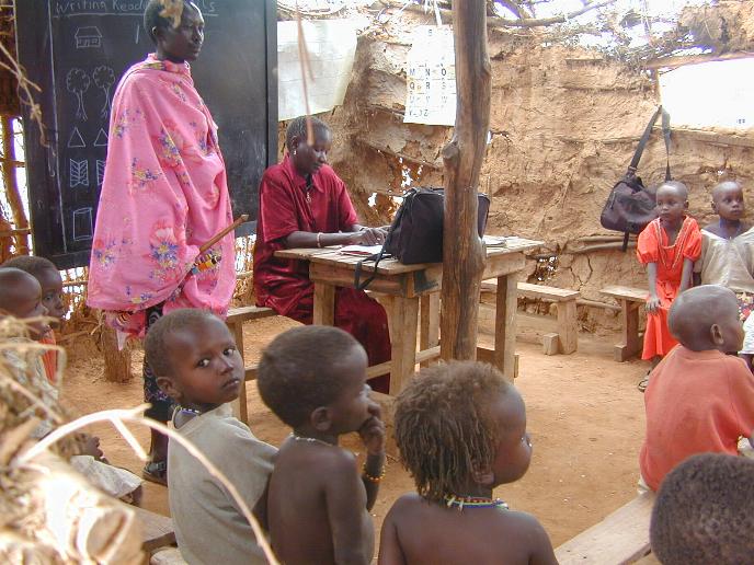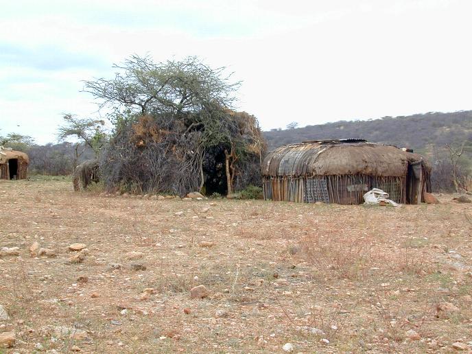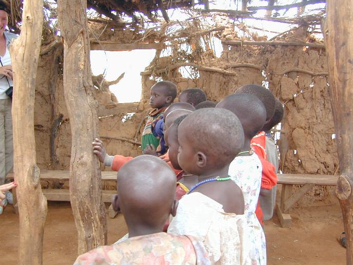 The Samburu village is surrounded by brush with a lot of spines and only has one entrance. They do this because they want to protect their most important assets, their cows, which live inside with them to be protected from lions, leopards, and hyenas. At night they pull another tree into the hole thus completing the fence. Inside the compound there are closets made from living trees and houses. Remember that this tribe is nomadic and can leave and abandon the house at the drop of a hat, so house improvements are rare. They live in the structure to the right and the structure to the left is a closet. Closets often contain calfs to be extra safe and you can see that a tug in with a tree branch and the entrance is blocked. There is an entrance to their house from within the closet. Walls in houses and schools are made of a mixture of mud and cow manure. Notice the addition of a few windows in the walls to let in more light for the children. Their houses are very dark and they have an inside fire so they are somewhat smokey, but that cuts the smell from other sources, such as the cows that are in the adjoined closet.