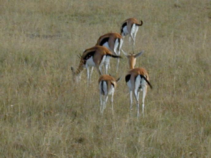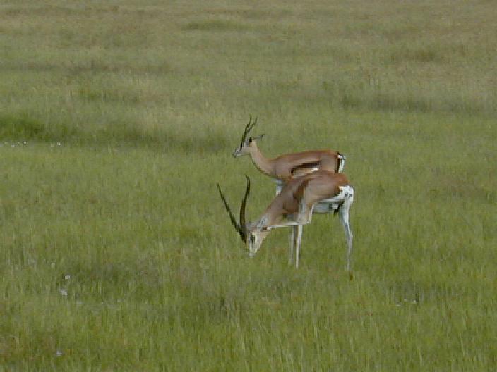 The Impala males as most of the antelope in Africa are quite often involved in dominancy fights. These two impala are butting heads to see which will stand down. What's at stake? Usually a male has a harem of 10 or more females and if pushed out by a badder male, must try to move in on another males herd. Behind them is a herd of Thompson's Gazelles