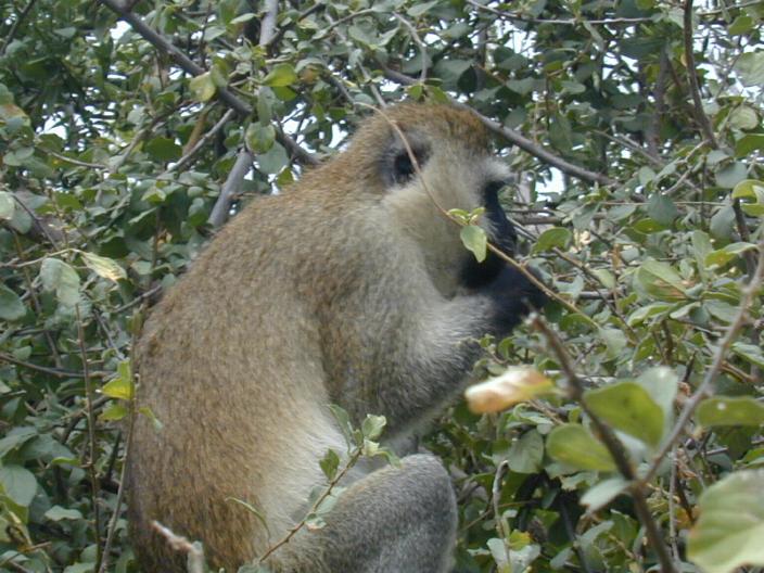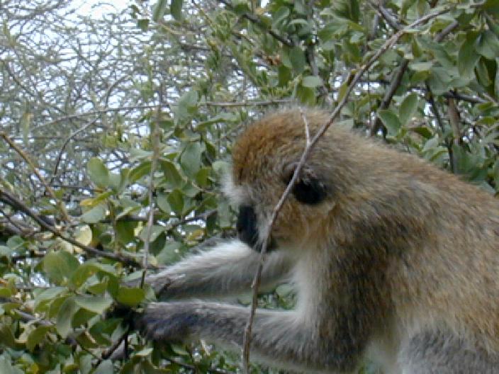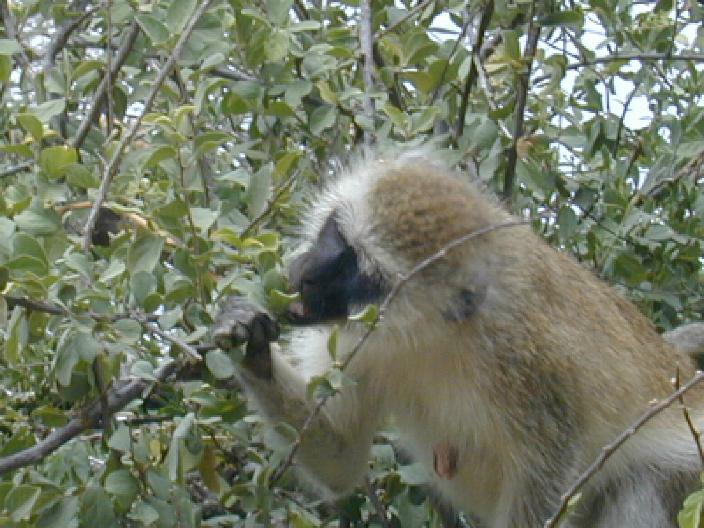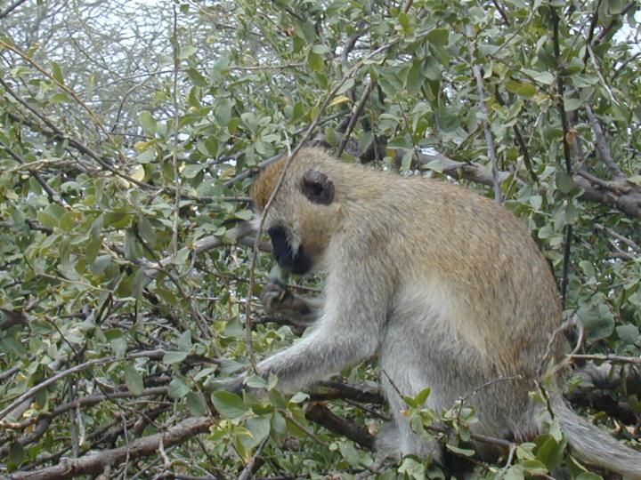 Black Faced Vervet Monkeys eat leaves and they are always found hunkered down picking away at the leaves and fruits