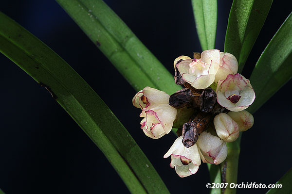 Found in Assam, northeast India, Nepal, Bhutan, Sikkim, Myanmar, Thailand, penninsular Malaysia?, Yunnan province of China, Vietnam, Java? in mixed, broad-leafed forests on rocky humus rich slopes at elevations of 340 to 2400 meters as a small to medium sized, hot to cool growing terrestrial or as an epiphyte on forest margins with a branching rhizome giving rise to erect, 12 to 24" [30 to 60 cm] long, unbranched, slender in the lower half, slightly thickened in the upper half stems carrying many, grasslike, chartaceous, tapering gradually from base to apex, unequally rounded-bilobed apically leaves that blooms in the summer on a terminal, subcapitate, short, densely several to many flowered inflorescence.