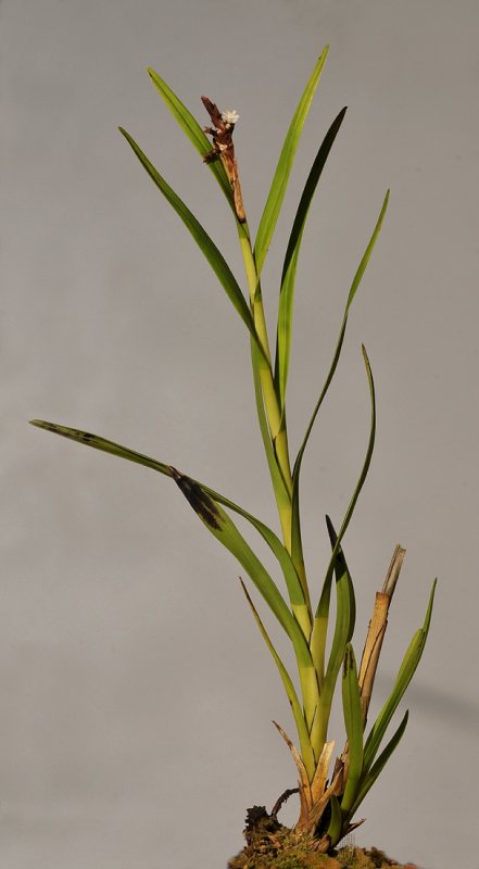 Found in New Guinea at elevations around 2000 meters as a large sized, cool to cold growing epiphyte with erect, strict, elongate, terete stems carrying erect-patent, linear-ligulate, narrowing slightly towards the obtusely bilobed apex leaves that blooms in the spring on an elongate, to 16" [40 cm] long, successively several flowered inflorescence