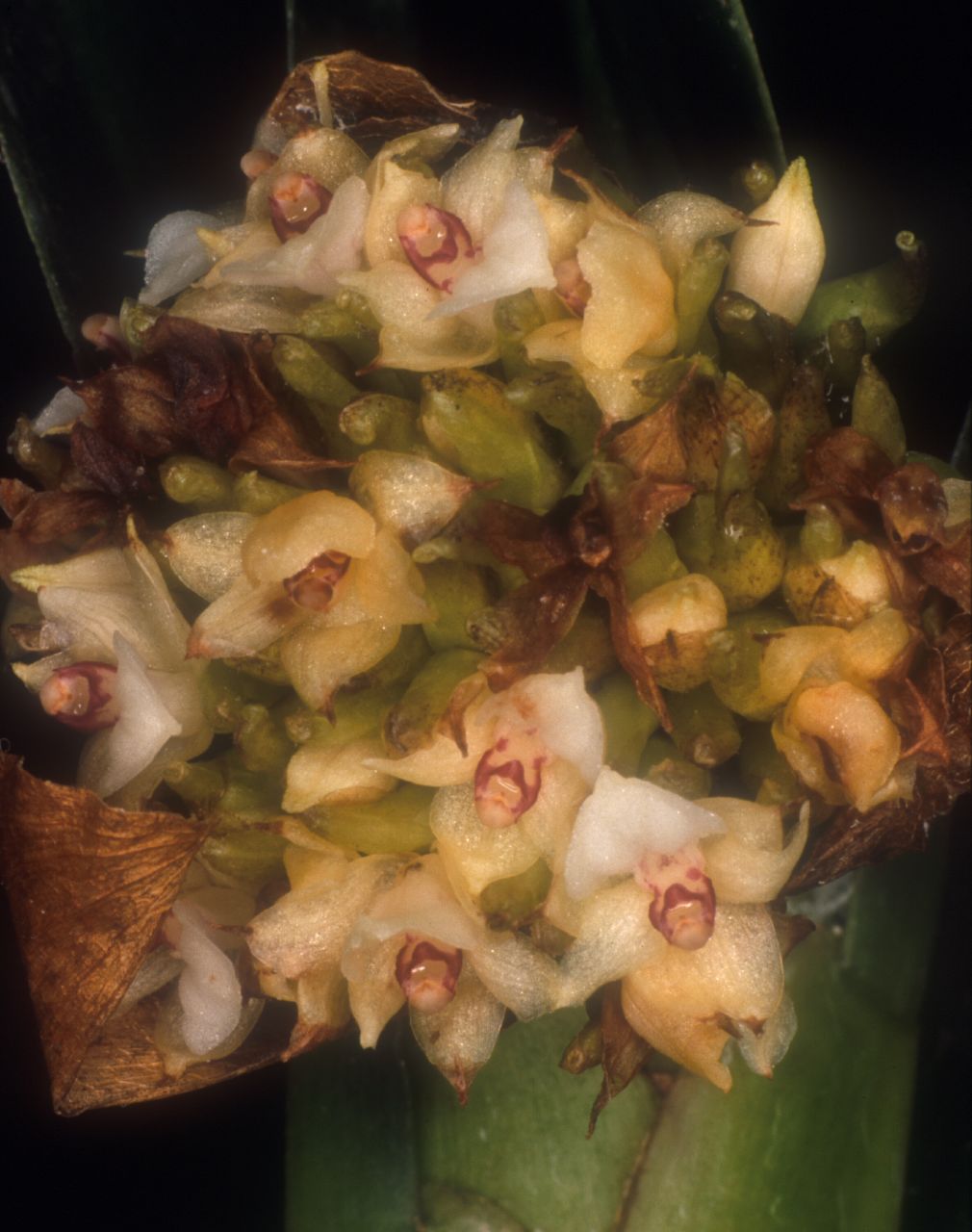 Found in the Philippines on tree trunks in montane forests at medium elevations as a small to medium sized, warm to cool growing epiphyte with erect, terete, slender stems carrying in the upper portion, 2 ranked, basally twisted, linear leaves that blooms in the late summer and early fall on a terminal, successively many flowered, corymblike [1 to 2 cm], very short inflorescence with 1 to several open flowers at any one time.
