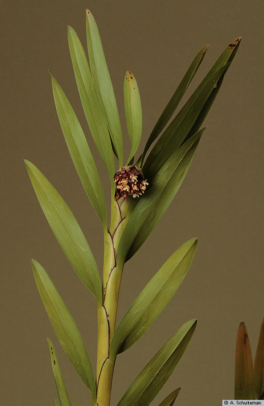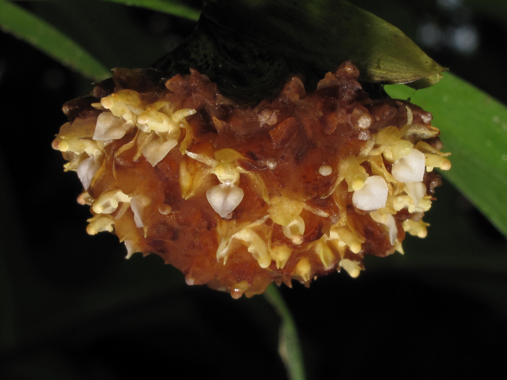 Found in Thailand, Borneo, Java, Malaysia, Sumatra, New Guinea, Solomon Islands and Vanuatu in lowland, hill and montane forest at elevations of 200 to 1500 meters as a large to giant sized, hot to cool growing epiphyte with a flattened stem that widens towards the apes and carrying many, linear, smaller from the base larger towards the apex, basally clasping, obtuse leaves that blooms on a terminal, many, short, crowded branched inflorescence arising on a mature growth and forming a head each carrying several small flowers