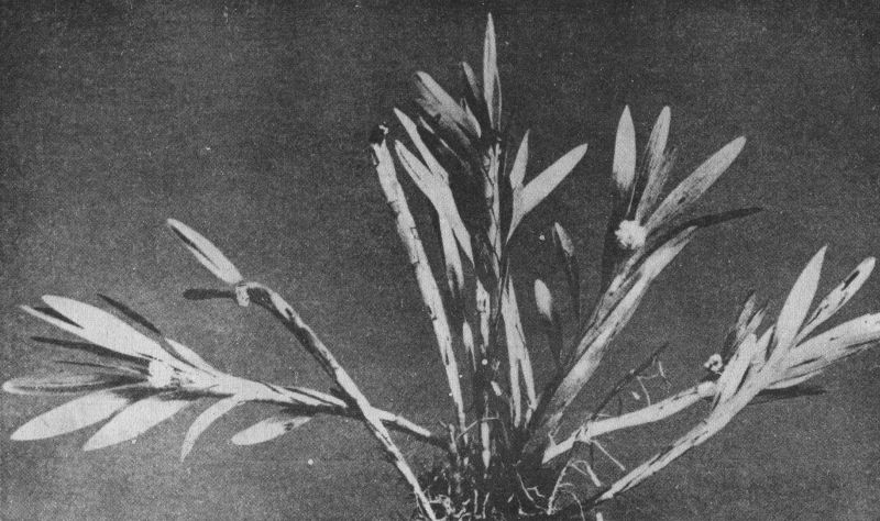 Found in the Philippines as a medium sized, cool growing epiphyte with a rather stout, glabrous, flattened, narrowing at the base stem carrying in the upper part, distichous, narrowly linear-oblong, obtuse, subcoriaceous, narrowing below into the rigid, clasping, jointed base leaves that blooms in the spring on a terminal, capitate, pluribracteate, to [3.5 cm] wide, many flowered inflorescence with very crowded, yellowish flowers.