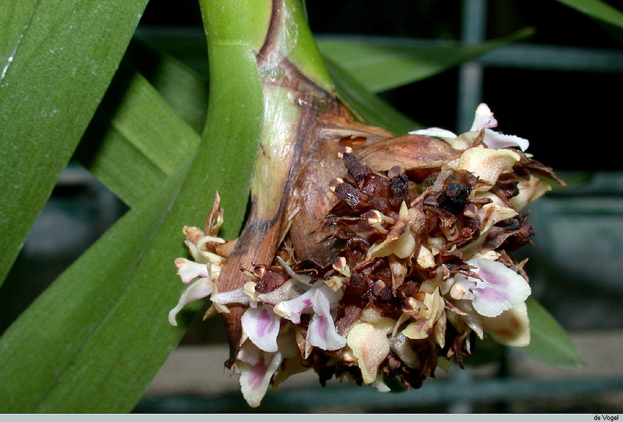 Found in the New Guinea in lowland forests at elevations of sealevel to 900 meters as a small to medium sized, hot to warm growing epiphyte with close set, compressed, many leafed stems with patent, half twisted basally, sublinear, gradually narrowing towards the unequally acutely bidentate or slightly emarginate apex with a small mucro, midrib grooved above, keeled below, coriaceous leaves that blooms in the spring and summer on a terminal, nodding, capitate, several short spiked, each 5 flowered inflorescence with large, ovate, obtuse floral bracts that conceal the ovary