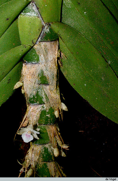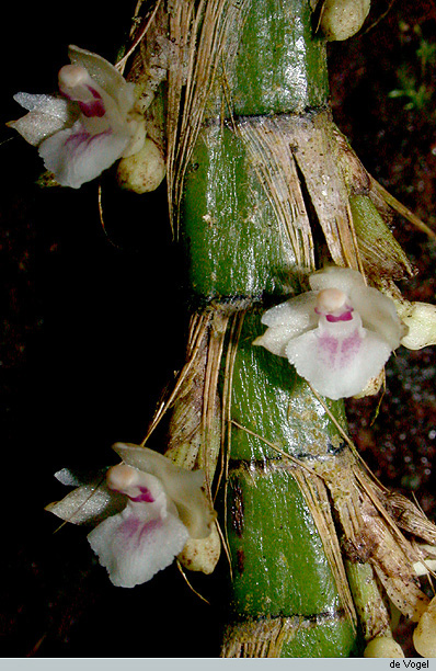 Found in New Guinea in shady montane forests at elevations of 450 to 1700 meters as a medium sized, hot to cool growing epiphyte with erect to pendulous, flattened stems enveloped in the basal third by inflated, loose to adpressed leaf sheaths and then leafy the middle third and many noded with evanescent sheaths that becomes fibery in time in the upper third, the leafy part with erect-patent, ovate-lanceolate, to linear-lanceolate, gradually narrowing to an acute or obtuse, equally bilobed or bidentate, sometimes with a mucro, basally twisted all in one plane leaves that blooms in the winter and spring on many very short, single flowered inflorescence arising from beneath the many fibery leafless sheaths at the upper third of the stem one to each node junction.