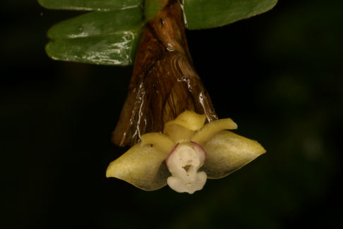 Found in Sumatra and Borneo in lowlands as a medium sized, hot growing epiphyte with many, oval in cross-section, pendent stems carrying many, close set, 2 ranked, basally twisted, oblong, equally bilobed apically, with a sharp spike in between leaves that blooms on a terminal, in a .4" [1 cm] wide head