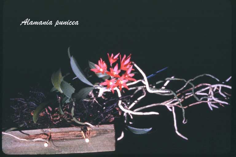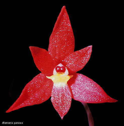 References W3 Tropicos, Kew Monocot list , IPNI ; Encylopedia of Cultivated Orchids Hawkes 1965; Die Orchideen 3 Auflage Bd 1 Sonderabdruck aus Schlechter Lieferung 8 449 - 512 Brieger, Maatsch and Senghas 1976; Orchid Digest Vol 46 No 4 1982 photo fide; Flora Novo-Galaciana Vol 16 McVaugh 1985; An Introduction to the Orchids Of Mexico Wiard 1987 photo fide; Miniature Orchids Northern 1988; Manual of Cultivated Orchids Bechtel, Cribb, Laurent 1992 photo fide; The Illustrated Encyclopedia of Orchds Pridgeon 1992; The Cattleyas and Their Relatives Volume 5 Withner 1998 photo fide; Rudolf Schlechter Die Orchideen Band 1C lieferung 42 - 43 pg 2626 - 2762 Brieger 2001 photo fide; Icones Orchidacearum 5 & 6 Orchids Of Mexico Parts 2 & 3 Plate 516 Hagsater, Soto 2003 drawing fide; A Compendium of Miniature Orchid Species Parsons & Garritsen 2013 photos fide; A Compendium of Miniature Orchid Species Parsons & Gerritsen 2013 as Alamania punicea subsp. greenwoodiana photos fide