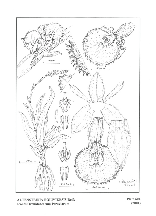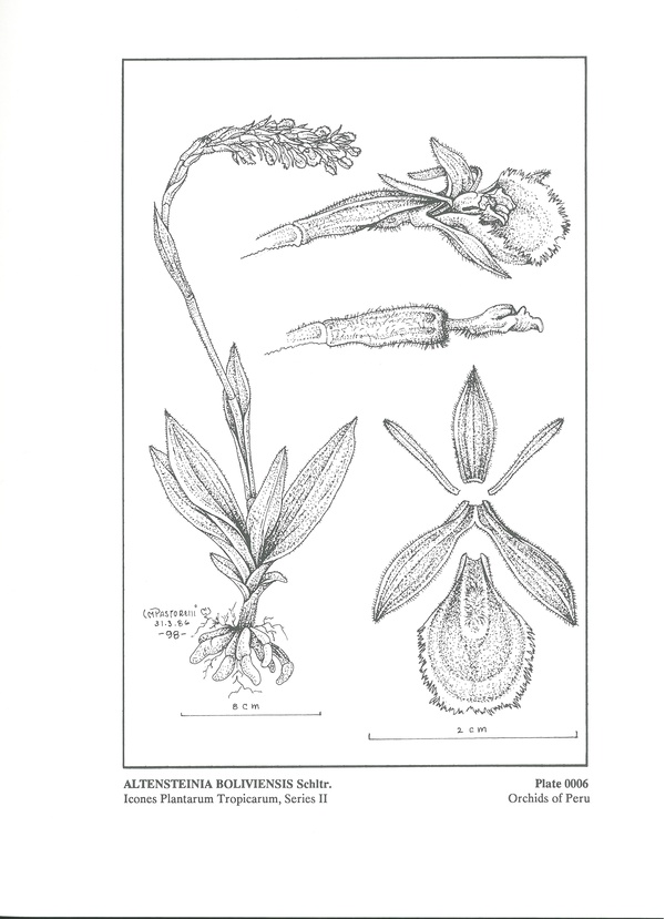 Found in Bolivia and Peru on grass and shrub covered rocky slopes and montane wet forests at elevations around 2200 meters as a medium szied, cold growing terrestrial with a stem enveloped by imbricating, lanceolate, oblanceolate, to ovate, acute, basally clasping leaves in a basal rosette, becoming clasping above that blooms in the summer through fall on an erect, terminal, long-pedunculate, racemose, to 20" [50 cm] long, conic-cylindric, densely many flowered, spicate inflorescence carrying non-resupinate flowers.