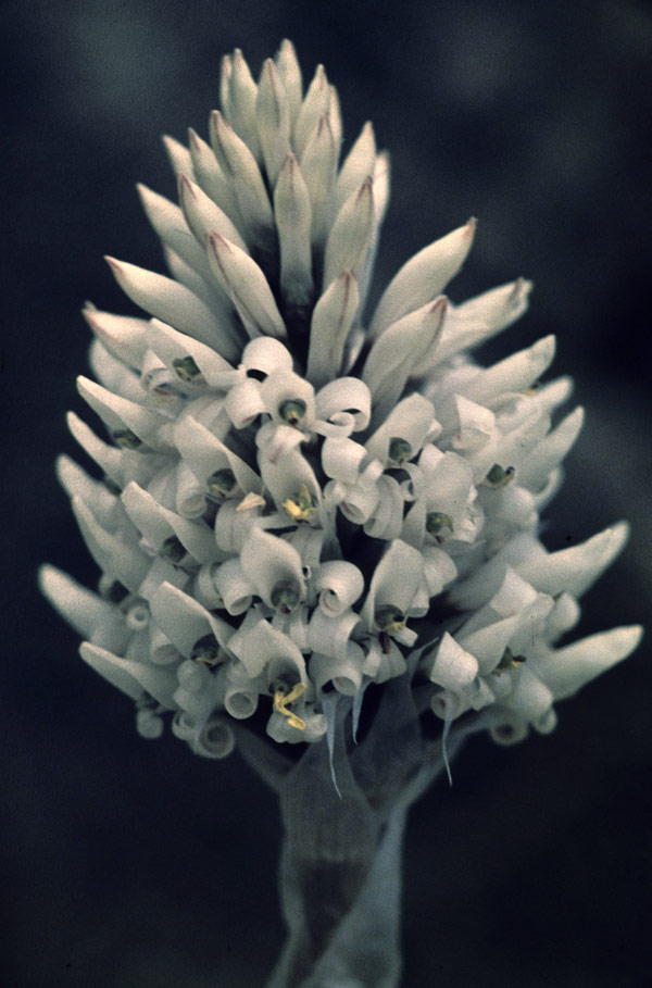 Found in Peru at elevations around 3600 meters as a medium sized, cold growing terrestrial with a glabrous, leafy below, enveloped above by loose, often leafy tubular bracts and carrying 4 to5, elliptic-lanceolate to oblong-lanceolate, acute to acuminate, gradually narrowing below intothe broad, imbricating, petiolate base leaves that blooms on a terminal, erect, to 6" [15 cm] long, long-cylindric, rachis glandular-pilose, densely many flowered inflorescence with ovate to ovate-lanceolate, acute to aciuminate, shorter to equal to the length of the flowers.