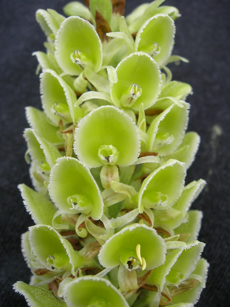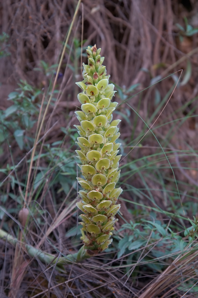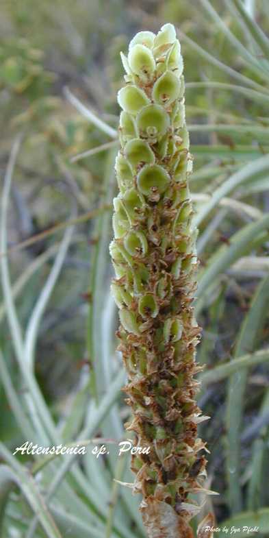 This robust, terrestrial plant is photographed in situ in Pisac, Peru and also occurs in Colombia, Venezuela, Ecuador and Bolivia at an elevation of 1800 to 3300+ meters on grassy or rocky slopes in wet montane forests or cloud forests and on steep, brush covered slopes of broken granite rock, where it was blooming in May but can be found in bloom in the late spring and early summer. It has cauline, lanceolate, clasping, acuminate, spirally arranged, yellow green leaves and blooms on a terminal, erect, 15" [37.5 cm] long, spicate [looks like a bottle brush] raceme with numerous basal bracts.