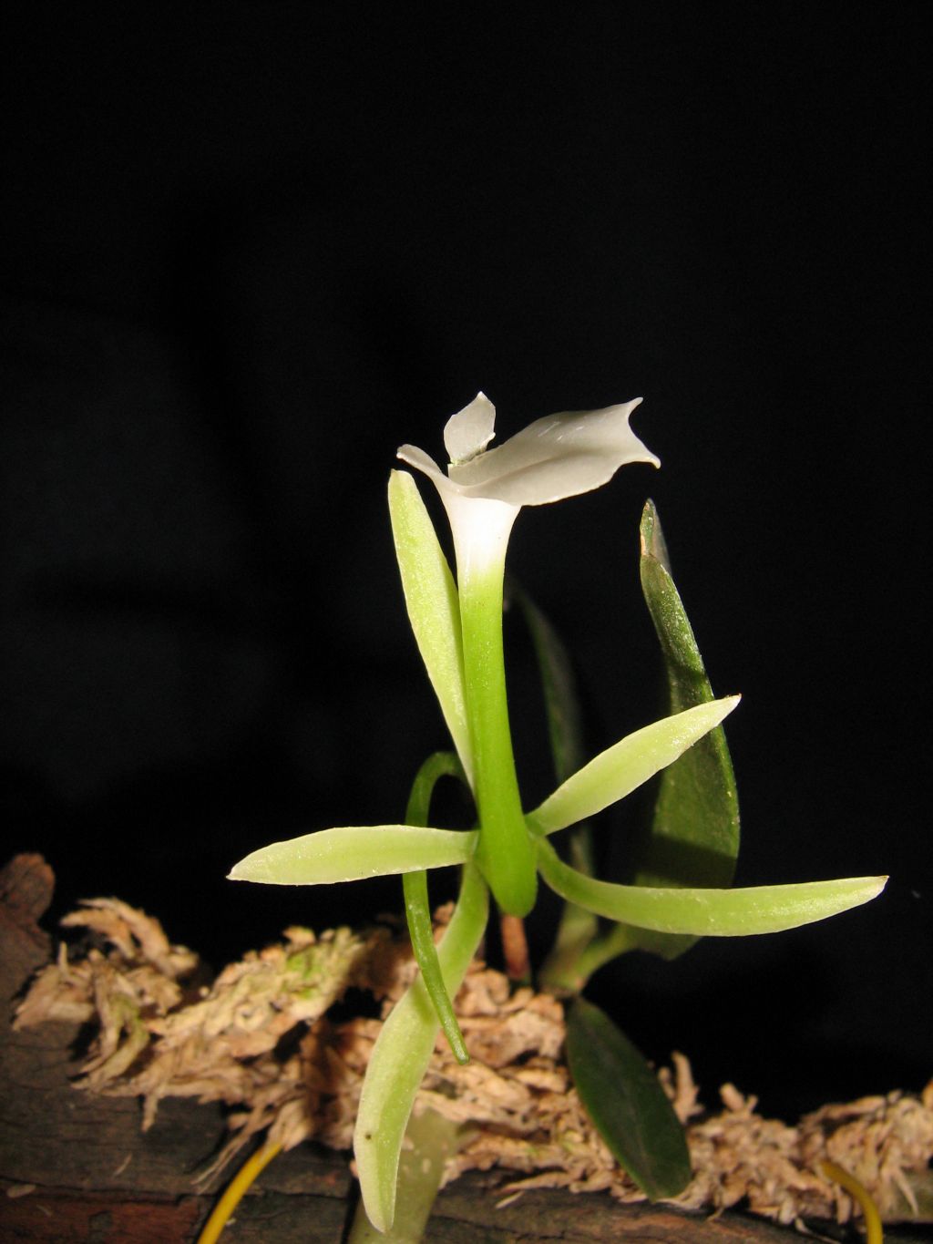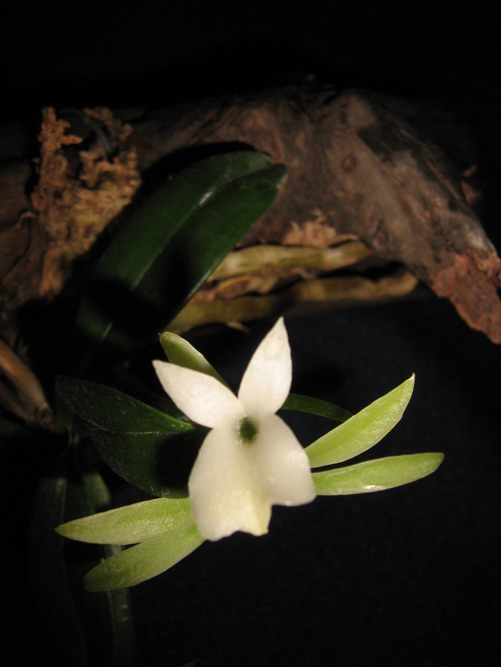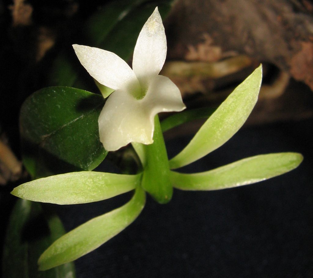 Found in Madagascar in humid, evergreen forests at elevations around 500 to 1000 meters as a mini-miniature sized, warm growing epiphyte with a short, erect stem carrying 5 to 6, flat, elliptic to oboval-oblong, unequally and obtusely bilobed apically, contracted towards the base leaves that blooms in the spring on an arising from below the leaves, 2 to 2.4" [5 to 6 cm] long, 1 to 3 flowered inflorescence with a few wide, thin, apiculate bracts.