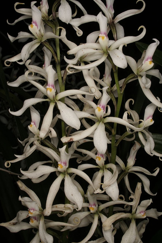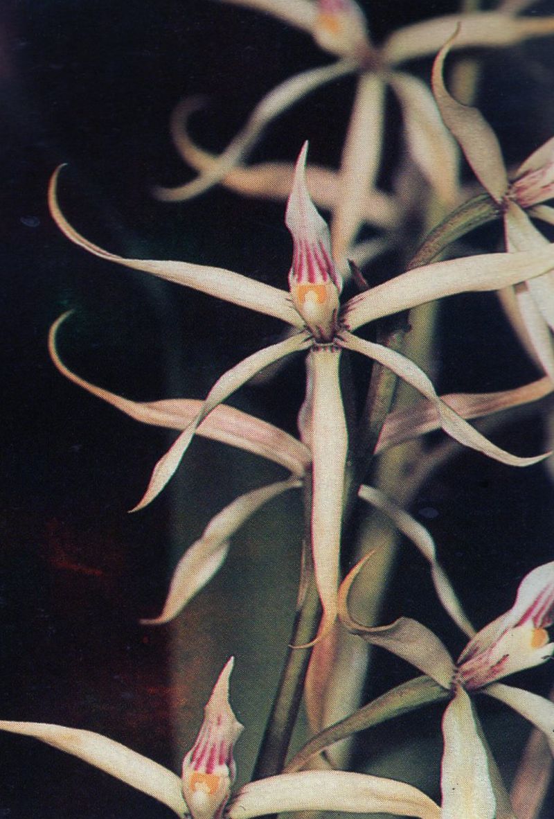 Found in southeastern Brazil on trees and rocks in cloud forests at elevations of 1000 to 1300 meters as a medium sized, cool growing with elongate, ovoid, compressed pseudobulbs carrying 2 to 3, strap-shaped leaves that blooms in the summer and fall on a terminal, erect, fleshy, 4 to 4.8" [10 to 12 cm] long, 6 to 15 flowered inflorescence carrying non-resupinate, clove scented flowers.