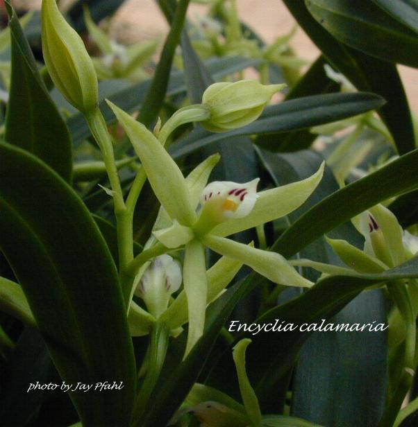 References W3 Tropicos, Kew Monocot list , IPNI ; Orchidaceae Brasilensis Pabst & Dungs 1972 as Epidendrum calamarium; Venezuelan Orchids Illustrated Vol 6 Dunsterville & Garay 1976 as Epidendrum calamarium drawing fide; Orchids of Venezuela ; An Illustrated Field Guide Vol 1 Dunsterville & Garay 1979 as Epidendrum calamarium drawing fide; The Orchids of Surinam Werkhoven 1986 as Encyclia calamaria photo fide; The Manual Of Cultivated Orchid Species Bechtel, Cribb & Launert 1992 as Encyclia calamaria drawing/photo fide; Manual of Orchids Stewart 1995 as Encyclia calamaria; Manual of Cultivated Orchids Bechtel, Cribb, Laurent 1992; Orchids of the High Mountain Atlantic Rainforest in SE Brazil Warren & Miller 1994 as Encyclia calamaria; Orchids of Venezuela [An illustrated field guide] Vol. 3 Ramiro and Carnevali 2000 as Prosthechea calamaria drawing fide; Flora of the Venezuelan Guayana Vol 7 Steyermark, Berry, Yatskievych and Holst 2003 as Prosthechea calamaria; The Cattleyas and Their Relatives, the Debateable Epidendrum Withner and Harding 2004 photo fide; Orchids of Bolivia Vol 2 Laelinae Vasquez and Ibisch 2004 as Prothechea calamarium photo fide; Orchidees Du Bresil As Orchideas da Serra Do Castello Vol 3 Chiron & Bolsanello 2013 as Prosthechea calamaria drawing/photo fide; AOS Bulletin Vol 83 #6 2014 as Prosthechea calamaria photo fide;
