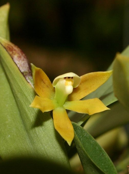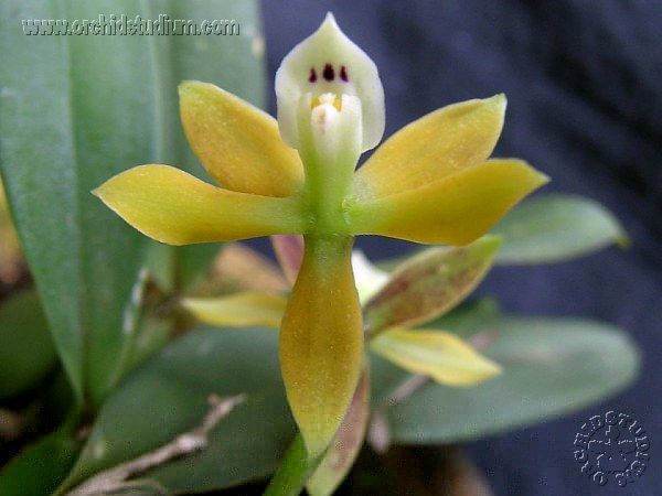 Found in Espirito Santo state of Brazil occuring on tree trunks in the Atlantic forest as a mini-miniature sized, warm to cool growing epiphyte with a thick, flexuous, ash gray rhizome from which arise a slightly wrinkled, compressed, ovate pseudobulb enveloped almost completely by a sheath and carries a single, ovate, acute leaf that blooms in the Brazilian summer on a terminal, to 2" [5 cm] long, 2 to 4 flowered, racemose inflorescence holding the large flowers at leaf height.