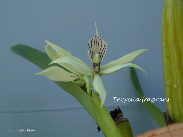 Synonyms Encyclia fragrans [Swartz] Lemee 1955; Epidendrum cochleatum Curtiss; Epidendrum cordatum Ruiz & Pav. 1798; *Epidendrum fragrans Sw. 1788; Epidendrum fragrans var. ionoleucum Hoffm. ex Barb Rod 1881; Epidendrum fragrans var. magnum Stein. 1892; Epidendrum fragrans var. pachupus Schlechter 1922; Epidendrum ionoleucum Hoffm. ex Rchb.f 1852; Epidendrum lineatum G. Salisb. 1796; Epidendrum vaginatum Sesse & Mocino 1894; Hormidium fragran [Sw] Brieger 1961; Prosthechea fragrans (Sw.) W. E. Higgins 1997