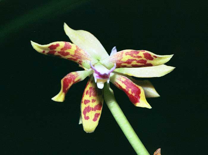 This small to medium sized, cool to cold growing, epiphytic species is found from Venezuela, Colombia, Ecuador, Peru and Bolivia in very wet montane forests on moss covered trees at elevations of 1300 to 3100 meters often in full sun with clustered, compressed, conical to ellipsoid pseudobulbs carrying a single [mostly], linear-elliptic, acute leaf and blooms in the spring on an apical, 5 1/2" [14 cm] long, erect, few to several flowered, racemose inflorescence arising on a newly matured pseudobulb with fleshy, non-resupinate flowers.