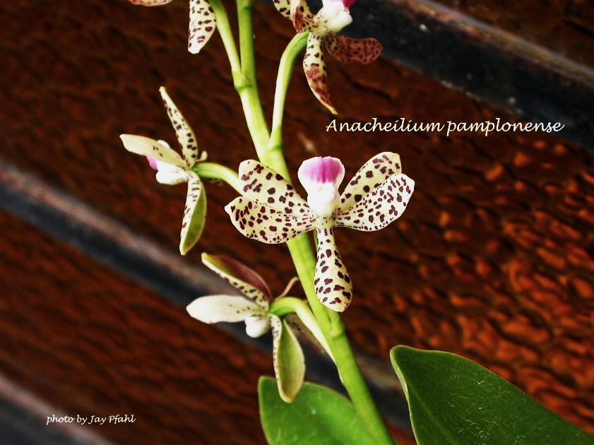 References W3 Tropicos, Kew Monocot list , IPNI ; Bonplandia Rchb.f 1854 as Epidendrum pamplonense; Repert. Spec. Nov. Regni Veg. Beih. 7: 249 Schlechter 1920 as Epidendrum pamplonenese; Die Orchideen 3 Auflage Bd 1 Sonderabdruck aus Schlechter Lieferung 9 513 - 576 Brieger, Maatsch and Senghas 1977 as Hormidium pamplonense; Orchids of Venezuela, An Illustrated Field Guide Vol 1 Dunsterville & Garay 1979 drawing fide; AOS Bulletin Vol 49 No 7 1980 photo; Orchids of Venezuela [An illustrated field guide] Vol. 3 Ramiro and Carnevali 2000 drawing good; *The Cattleyas and Their Relatives, the Debateable Epidendrum Withner and Harding 2004 as Anacheilum pamplnense; Native Ecuadorian Orchids Vol 4 Dodson 2003 drawing/photo ; Orchids of Venezuela [An illustrated field guide] Vol. 1 Dunsterville and Garay 1979 as Epidendrum pamplonense; Orquideas Nativas del Tachira Cesar Fernandez 2003 photo fide; Native Ecuadorian Orchids Vol 5 Dodson 2004; Orquideas de Roirama Luz & Franco 2012 photo fide;