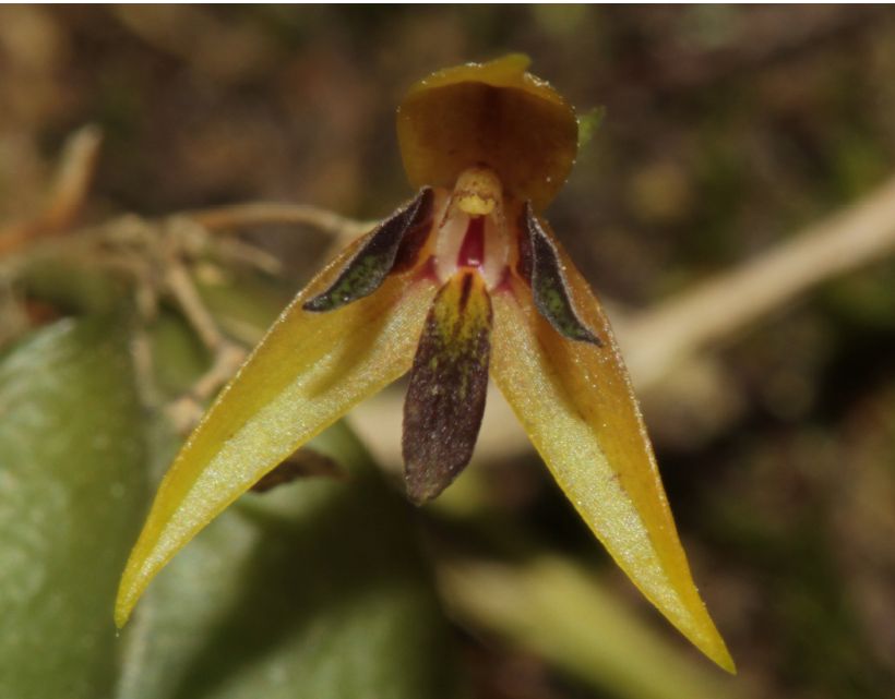 Found in Espirito Santo state of Brazil at elevations between 500 and 1200 meters as a mini-miniature sized, warm to cool growing epiphyte with erect, cylindric ramicauls enveloped by 4, membraneous, infundibuliform, acute, imbricating sheaths and carrying an erect, fleshy, narrowly elliptical-ovate, rounded and shortly recurved, conduplicate below into the base leaf that blooms on up to 5, peduncle .28" [7 mm] long, rachis fractiflex, successively single, 7 flowered inflorescence