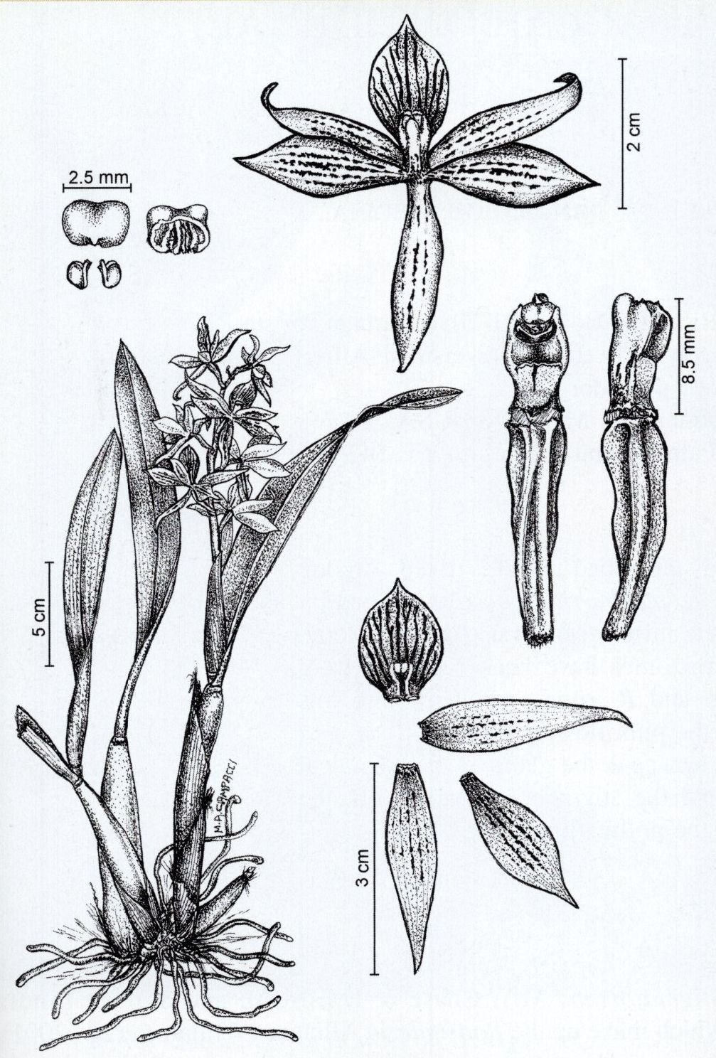 Found in Sao Paulo state of Brazil in the Atlantic rainforest at elevations of 200 to 300 meters as a small to medium sized, hot to warm growing epiphyte with fusiform, laterally compressed pseudobulbs enveloped basally by deciduous sheaths and carrrying 1 to rarely 2, apical, subcoriaceous, oblong, obtuse, gradually narrowing below into the base leaves that blooms in the spring on a terminal, racemose, erect, to 5" [12.5 cm] long, to 8 flowered inflorescence arising through a spathe and carrying non-resupinate, simulataneously opening flowers.