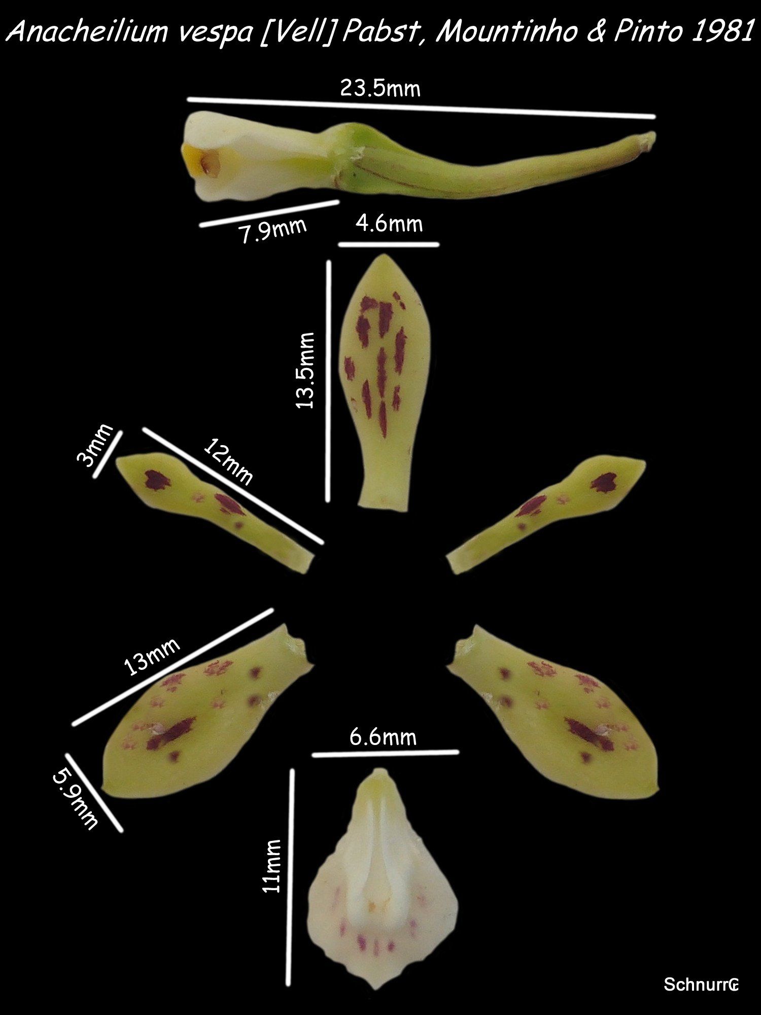 Previously this species covered a wide range of plant and flower varieties but with Marcos Campacci's rediscovery of the true A vespa that Vellozo originally described all other forms have been moved to A crassilabia or A tigrina. This species can only be kept in Anacheilum as there is no corresponding species name available in Encyclia.