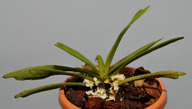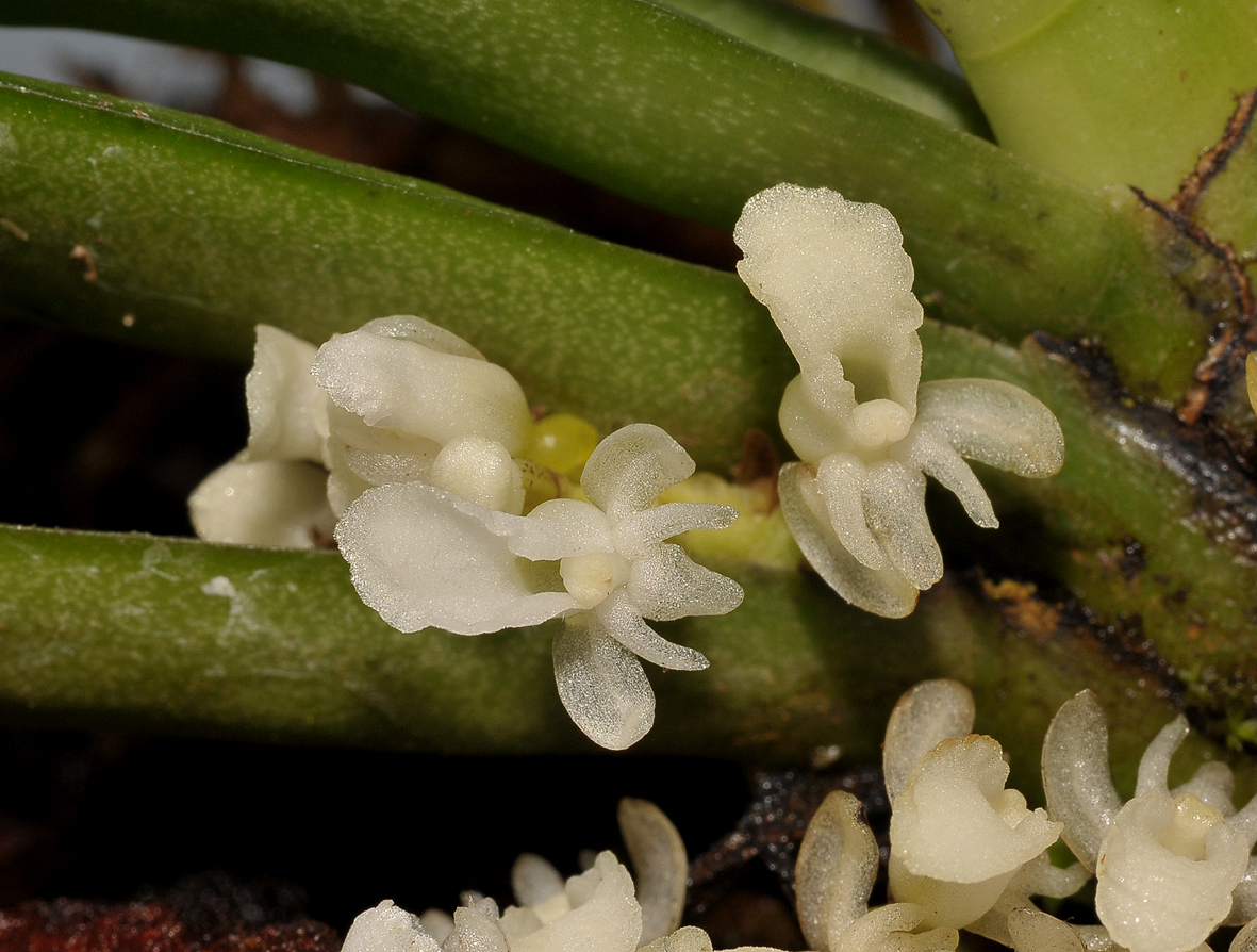 Found in Ivory Coast, Liberia and Nigeria in shady humid forests at elevations of 100 to 500 meters as a small to medium sized, hot growing epiphyte with an erect to pendent, curved stem carrying 2 ranked, narrowly lanceolate, rigid, unequally bilobed apically, the longer lobe narrow and pointed , the shorter lobe absent leaves that blooms in the later spring on an axillary, racemose, .5 to .56" [1.2 to 1.4 cm] long, 7 to 10 flowered inflorescence