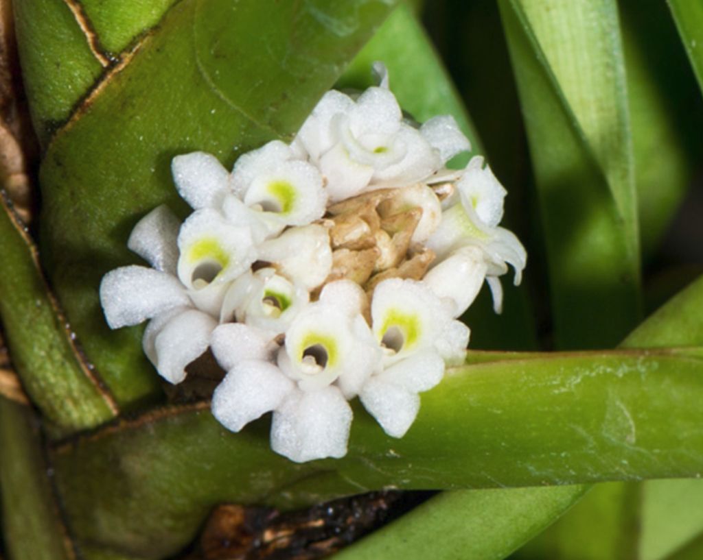Found in The Congo, Gabon, Zaire, Central African Republic and Uganda in evergreen forests at elevations of 1200 to 1600 meters as a small sized, cool growing pendent to ascending epiphyte with an arcuate stem carrying up to 12, linear, unequally bilobed apically, each lobe subacute to obscurely 2 toothed, basally twisted , articulate to imbricate basally leaves that blooms in the later spring on a capitate, .4 to .8" [1 to 2 cm] long, , many flowered inflorescence with ovate-lanceolate to ligulate, acute, as long to longer than the ovary floral bracts.
