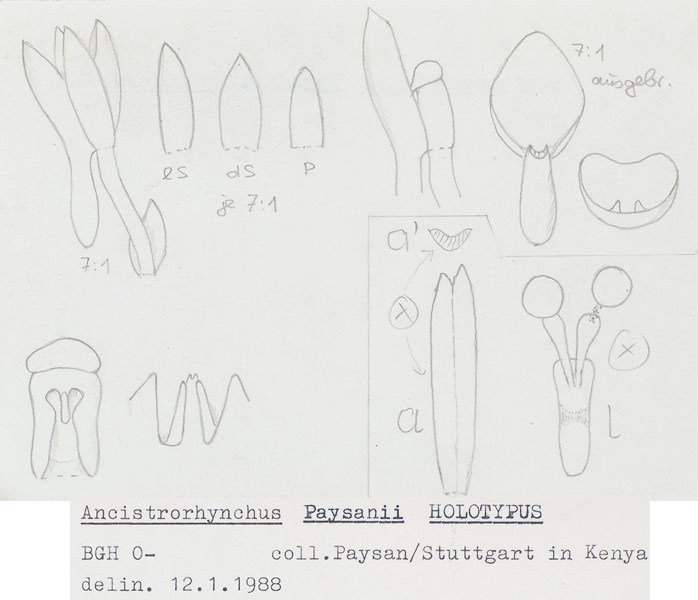Ancistrorhynchus paysanii Senghas 2001 Drawing by © Karl Senghas and The Swiss Orchid Foundation at the Jany Renz Herbaria Website