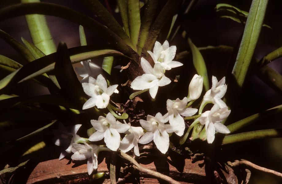 Found in Tanzania in montane evergreen forests at elevations of 900 to 2100 meters as a small to medium sized, warm to cold growing epiphyte with an erect, very short stem carrying 6 to 8, fleshy-coriaceous, conduplicate, linear, unequally bilobed apically, articulate to the imbricate leaf sheaths below leaves that blooms in the winter and later spring on clustered, 1.2 to 1.4" [3 to 3.5 cm] long, few flowered inflorescence with ovate, acute bracts.