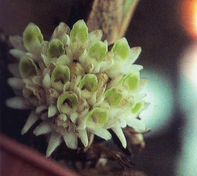 Found in Cameroon, Central African Republic, Congo, Equatorial Guinea, Gabon, Liberia, Nigeria, Sierra Leone, Togo, Uganda, Zaire at elevations of 100 to 1300 meters in deep shade in evergreen forests as a small sized, hot to cool growing epiphyte with a short stem carrying several, linear, stiff and leathery, unequally bilobed at the apex leaves with each lobe having 2 to 3 sharp teeth and gives rise to an axillary, 1" [2.5 cm] long, densly many flowered, racemose inflorescence with the flowers held beneath the leaves occuring in the early spring.
