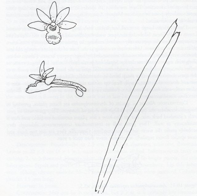 Found in Ghana, Guinea, Ivory Coast, Nigeria, Liberia, Sierra Leone and Togo in evergreen forests as a miniature to small sized, warm to cool growing epiphyte with an erect stem carrying several, linear, slightly folded at the base, bilobed apically with erose lobes leaves that blooms in the spring on a densely many flowered inflorescence enveloped by large chaffy bracts and carries a ball of scented flowers