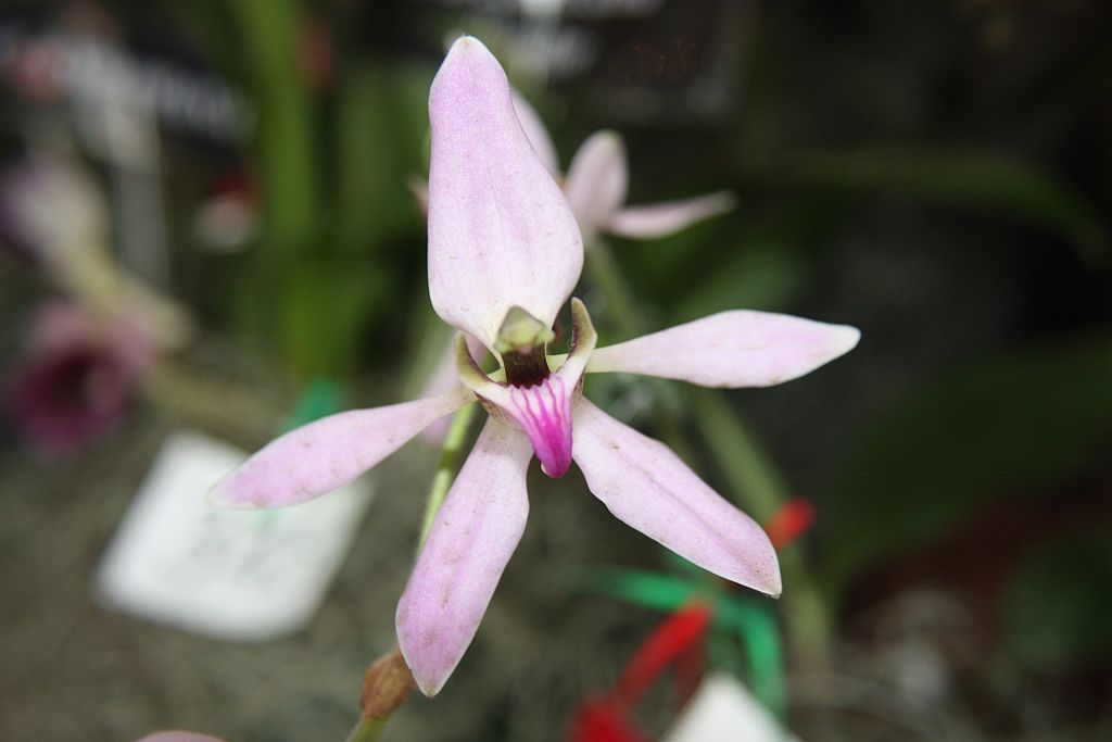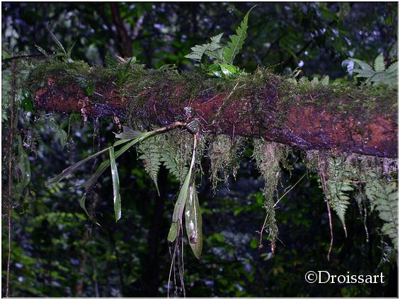 A sympodial, deciduous leaved orchid, with pseudobulbs that look like Hershey's kisses. It is a warm to cool growing epiphyte from Guinea, Sierra Leone and across to Uganda on bare trunks and larger branches of large forest trees at elevations of 500 to 1100 meters that can be potted and watered regularly while growing and less when not. This small to medium sized epiphyte has clustered, conical or pyriform pseudobulbs with 2 apical, lanceolate to elliptic-lanceolate or oblanceolate, acute or acuminate, broad, thin textured leaves and blooms in the winter, summer and fall on a basal, arching, to 8" long, pubescent inflorescence, from from the base of the leafed or leafless pseudobulb and can carry 2 to 5, large, fragrant flowers.