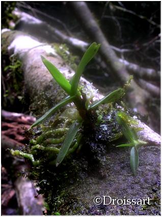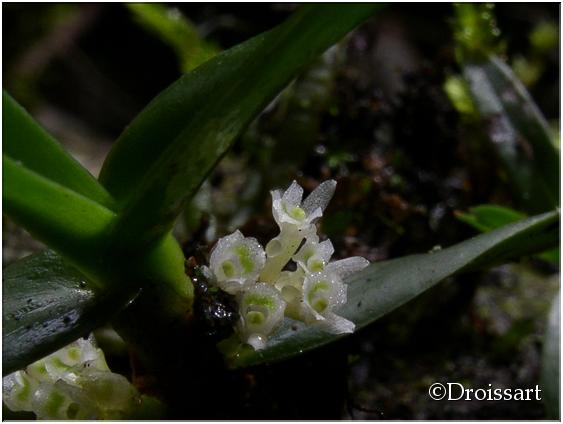 Found in Gabon, Zaire, Rwanda, Uganda, Tanzania and Malawi in evergreen forests at elevations around 900 to 1400 meters as a mini-miniature sized, warm to cool growing epiphyte with a short ascending to arcuate stem enveloped by leaf-bearing sheaths and carrying linear, clustered towards the apex, unequally bilobed apically leaves that blooms in the spring on a short, capitate, densely few to many flowered inflorescence with elliptic, obtuse bracts.