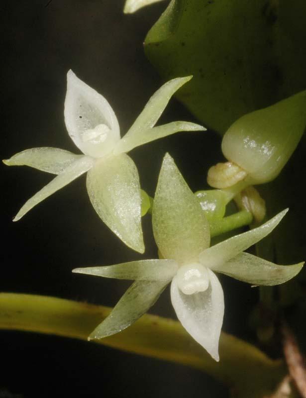 Found in central Madagascar in moss and lichen forests at elevations of 1000 to 2000 meters as a miniature sized, cool growing epiphyte with a very short stem carrying 5 to 9, lingulate, very unequally bilobed apically leaves in the upper half that blooms in the spring through summer on an axillary 4" [10 cm] long, 2 to 5 flowered inflorescence.