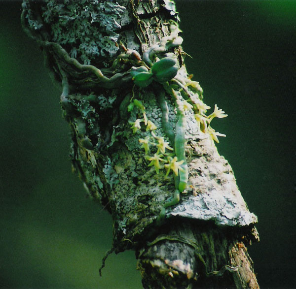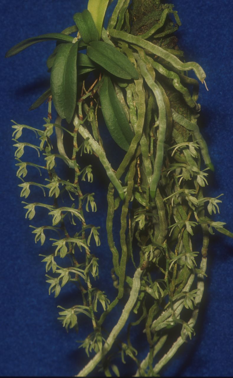 Found in Kenya, Tanzania Malawi, Mozambique and Zimbabwe as a small sized, warm to cold growing epiphyte in high rainfall areas, evergreen forests and occasionally on rocks at elevations of 750 to 2100 meters with a very short stem carrying 2 to 4, narrowly elliptic, blue green, almost fleshy, sometimes deciduous leaves that blooms in the fall on a pendant, several at once, 2 to 4" [5 to 10 cm] long, densely many [20] flowered inflorescence with fragrant flowers that smell of Lily of the Valley and are arranged in two rows.