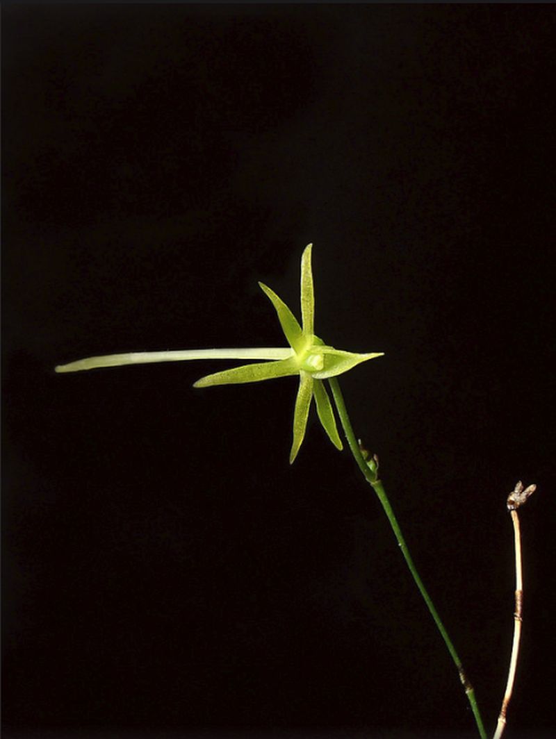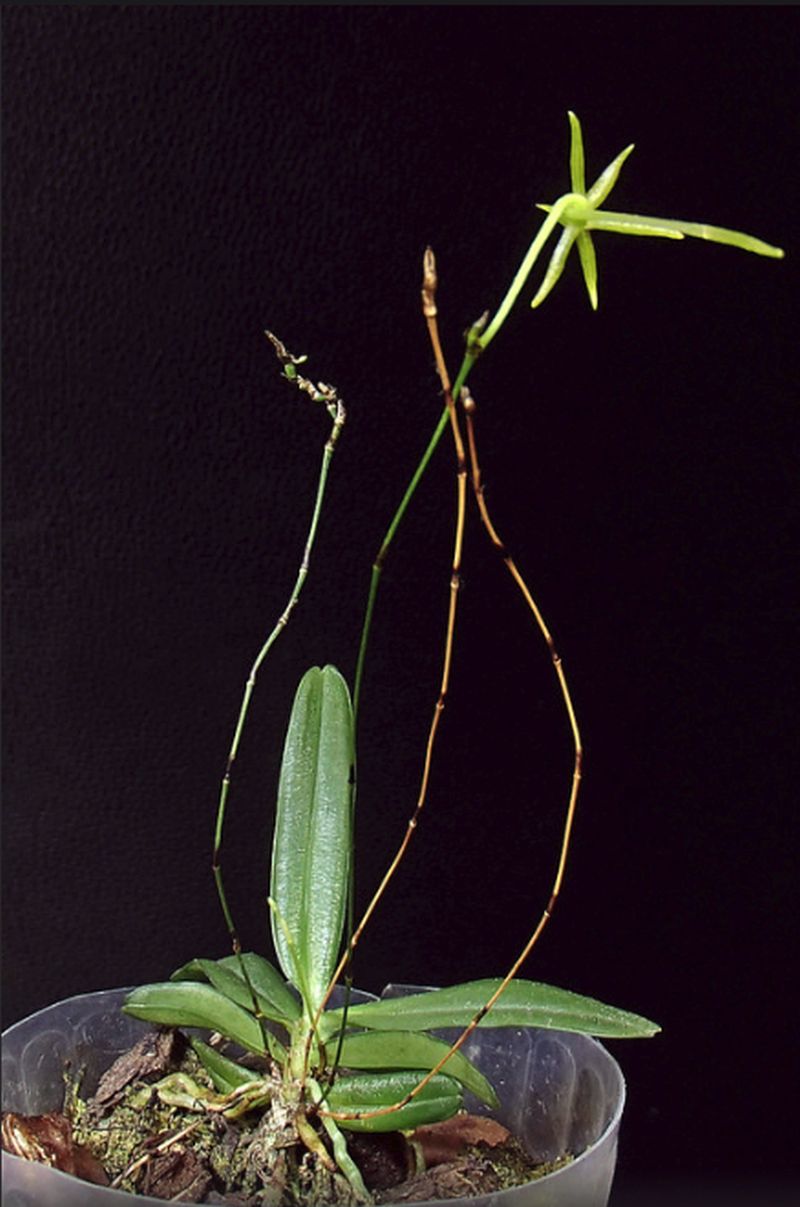 Found in northern and east central Madagascar in moss forests at elevations around 1000 meters as a mini-miniature sized, warm to cool growing epiphyte without a stem and 5 to 7, linear, unequally and obtusely bilobed apically leaves that blooms in the mid summer on numerous, from beneath the leaves, peduncle 2.4 to 4.8" [6 to 12 cm] long, filiform, with 5 to 7 distant sheaths 2.8 to 6" [7 to 15 cm] long overall, 1 to 2 flowered inflorescence carrying non-resupinate yellowing flowers