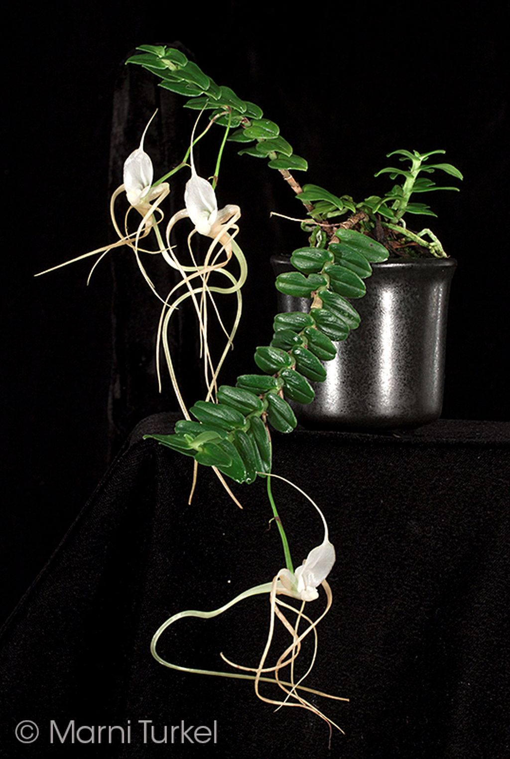 Found in central Madagascar in evergreen, humid forests at elevations around 1380 to 1500 meters as a miniature to just small sized, cool growing epiphyte with an erect to ascending, simple to sparsely branched stem enveloped completely by leafless and leaf-bearing sheaths and carrying spreading, oblong-ligulate, to ligulate, thin and leathery, unequally and obtusely bilobed apically, recurved and minutely serrate leaves that blooms in the later spring through early fall on an axillary, longer than the leaf, single flowered inflorescence with an ovate, spiculate floral bract and nocturnally fragrant flowers