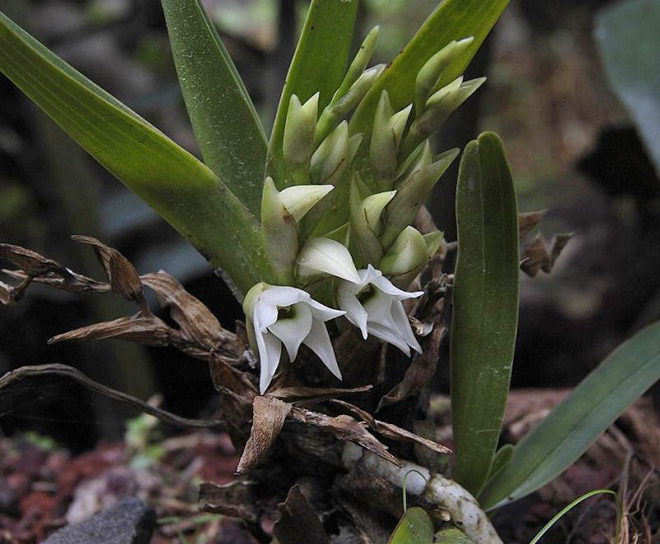 Found in Reunion and Mauritius at elevations of 700 to 1500 meters as a small sized, warm to cool growing epiphyte with erect stems enveloped basally by leaf-bearing sheaths and carrying 2 ranked, closely imbricating on the stem, dark green, distinctly veined, flexible, ligulate, unequally bilobed apically leaves that blooms in the late winter and early spring on an axillary, one-sided, erect, racemose, densely several flowered inflorescence