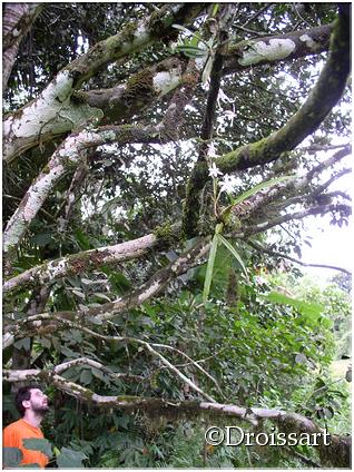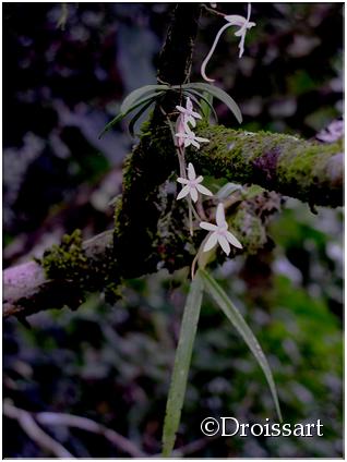 Found in Ghana, Ivory Coast, Central African Republic, Cameroon, Congo, Equatorial Guinea, Gabon, Zaire, Tanzania, Uganda and Angola in primary forest in deep shade on small twigs and branches at elevations of 100 to 1650 meters as a miniature sized, hot to warm growing epiphtye with a very short, woody stem carrying 2 to 6, 2 ranked, linear, often falcate, dark green with a few black dots, unequally and shortly bilobed apically leaves that blooms in the spring on an axillary or below the leaves, spreading to pendant, to 4.8" [12 cm] long, 2 to 10 flowered inflorescence.