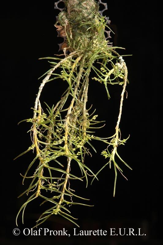 Found in central Madagascar on tree trunks in moss forests at elevations of 900 to 1400 meters as a miniature to small sized, warm to cool growing epiphyte with a slightly compressed, very thin stem carrying 3 to 6, distant, linear, very thin, rigid, caniculate-pleated, obtuse, unequally bilobed apically leaves that blooms in the summer and fall on an axillary, 3/4 to 2.4" [2 to 6 cm] long, 5 to 10 flowered inflorescence enveloped basally by 2 to 3 distant sheaths and carrying the small flowers close to the stem.