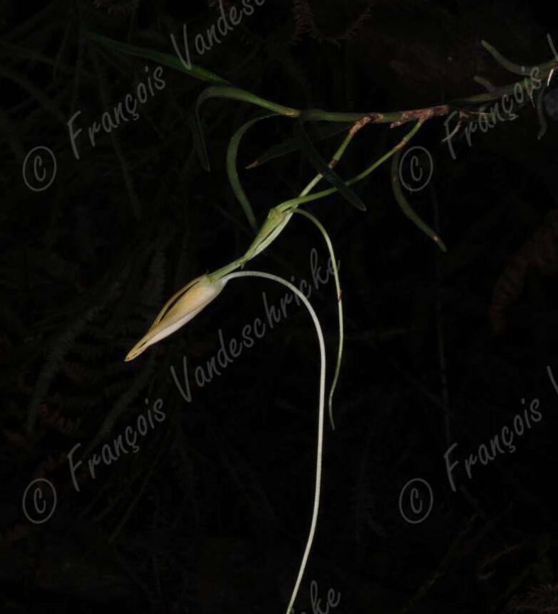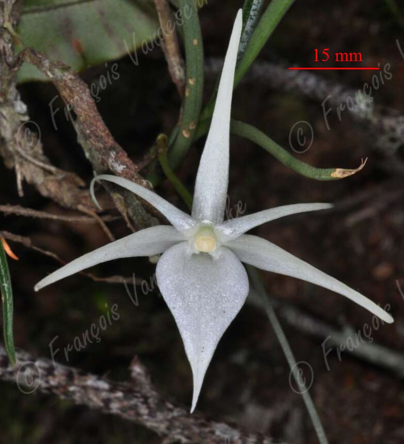 Found in Reunion at elevations of 600 to 1700 meters as a medium sized, warm to cool growing epiphyte with an erect stem carrying 2 ranked, dull bluish green, narrowly linear, almost terete, channeled on upper surface, subacute leaves that blooms in the late spring and earlier summer on an opposite the leaf, 2.4" [6 cm] long, single flowered inflorescence