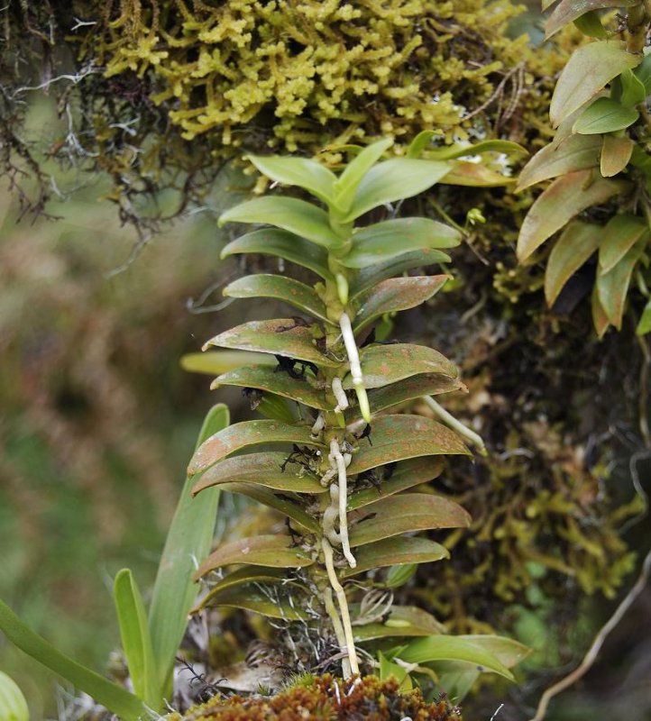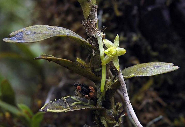 Found in Reunion and Mauritius in semi-shade at elevations of 1200 to 1800 meters as a medium sized, cool growing epiphyte with an erect, simple or branched stem carrying in the upper part, two ranked, bright green, lanceolate, unequally bilobed apically leaves that blooms in the fall on 1 to 2, axillary, intervallate, peduncle slender, short, usually 2 flowered, but 1 does not develop, axillary inflorescence carrying small green flowers