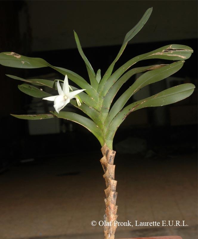 Found in Madagascar in mossy evergreen forests at elevations of 800 to 1500 meters as a miniature to small sized, warm to cool growing epiphyte with a short stem carrying a fan of 7, ligulate, emarginate, thick, fleshy, dark dull green, rough leaves that blooms in the summer through fall on an axillary, 1.2 to 1.4" [3 to 3.5 cm] long, single flowered inflorescence with 2 to 3 basal, obtuse, acute sheaths carrying a fleshy flower.