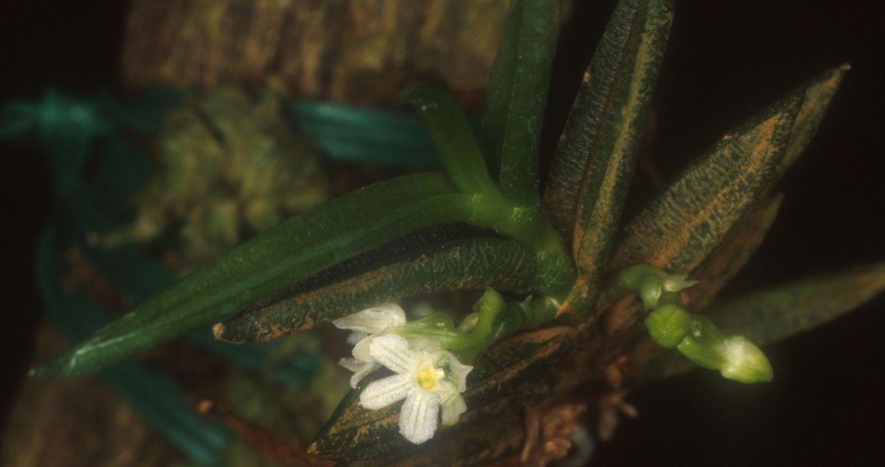 Found in southwestern Madagascar on bushes and succulents in dry regions and coastal forests at elevations up to 200 meters as a small sized, hot growing epiphyte with a very long, slender stem carrying reddish, recurved, linear, keeled below leaves that blooms in the late fall on an axillary, 2 to 4" [5 to 10 cm] long, 1 to 4 flowered inflorescence with a broadly oval, acute bract