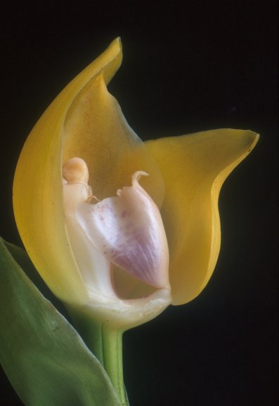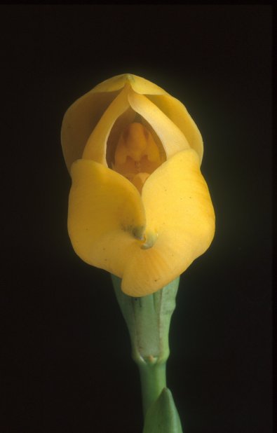 Found in Colombia at elevations of 1200 to 1800 meters as a medium to large sized, cool growing terrestrial with dark green, tapering pseudobulbs with small spines after leaf-fall and carrying 3, plicate leaves that blooms in the spring in Colombia and summer in cultivation in the north on up to 6, erect, 6" [15 cm] long, single flowered inflorescence with 3 to 4 sheathing bracts and a cucullate floral bract that is longer than the ovary and carrying a very fragrant flower scented akin to wintergreen.