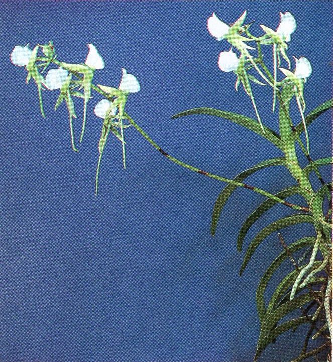 Found in Madagascar, the Mascarenes and Reunion as a large to giant sized, erect, hot to warm growing, monopodial epiphyte at elevations of sealevel to 750 meters with stout, branched stems carrying 10 to 15, rigid, coriaceous, ligulate, unequally bilobed apically leaves that blooms in the early winter in the northern hemisphere, on an axillary, ascending or horizontal, to 4' [120 cm] long, densly many flowered inflorescence with long-lived, inverted or non-resupinate, fragrant gardenia scented, heavily waxy flowers arranged in 2 ranks.