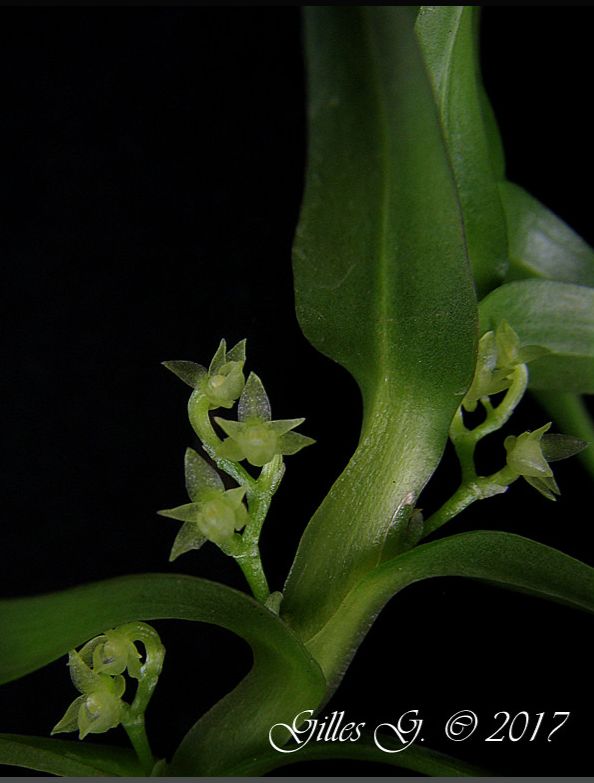 Found in south central Madagascar in shady forests at high elevations as a medium sized, cold growing epiphyte with long, flattened, branching stems carrying imbricate, 2 ranked, very distinctive, folded along the midline, compressed, oval, oblong, falcate to recurved, amplexicaul, apically bilobed leaves that blooms in the summer on an axillary, almost as long as the leaves, .6 to .72" [1.5 to 1.8 cm] long, 3 to 5 flowered inflorescence with a triangular, shorter than the ovary floral bract andcarrying small, green flowers