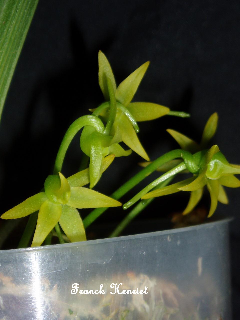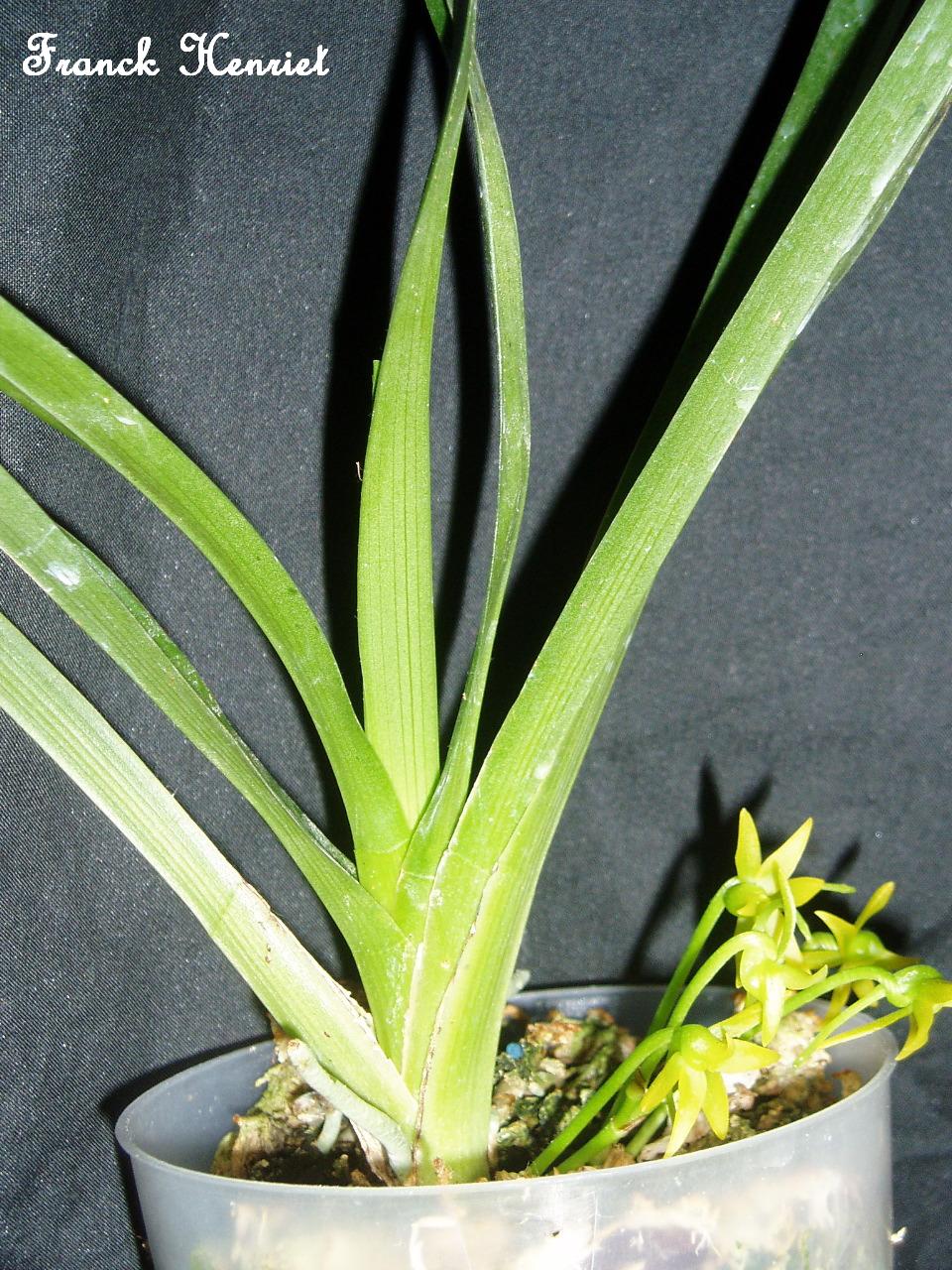 Found in eastern Madagascar in montane forests at elevations around 100 to 1000 meters as a hot to warm growing epiphyte with almost no stem carrying alternate, soft, lanceolate, light green leaves and blooms in the winter and spring on an axillary, short, 2 to 5 flowered inflorescence with resupinate, fragrant, [night scent of liquorice mixed with lily-of-the-valley aging into yellowish green flowers with a pure lily-of-the-valley scent], long-lasting flowers.