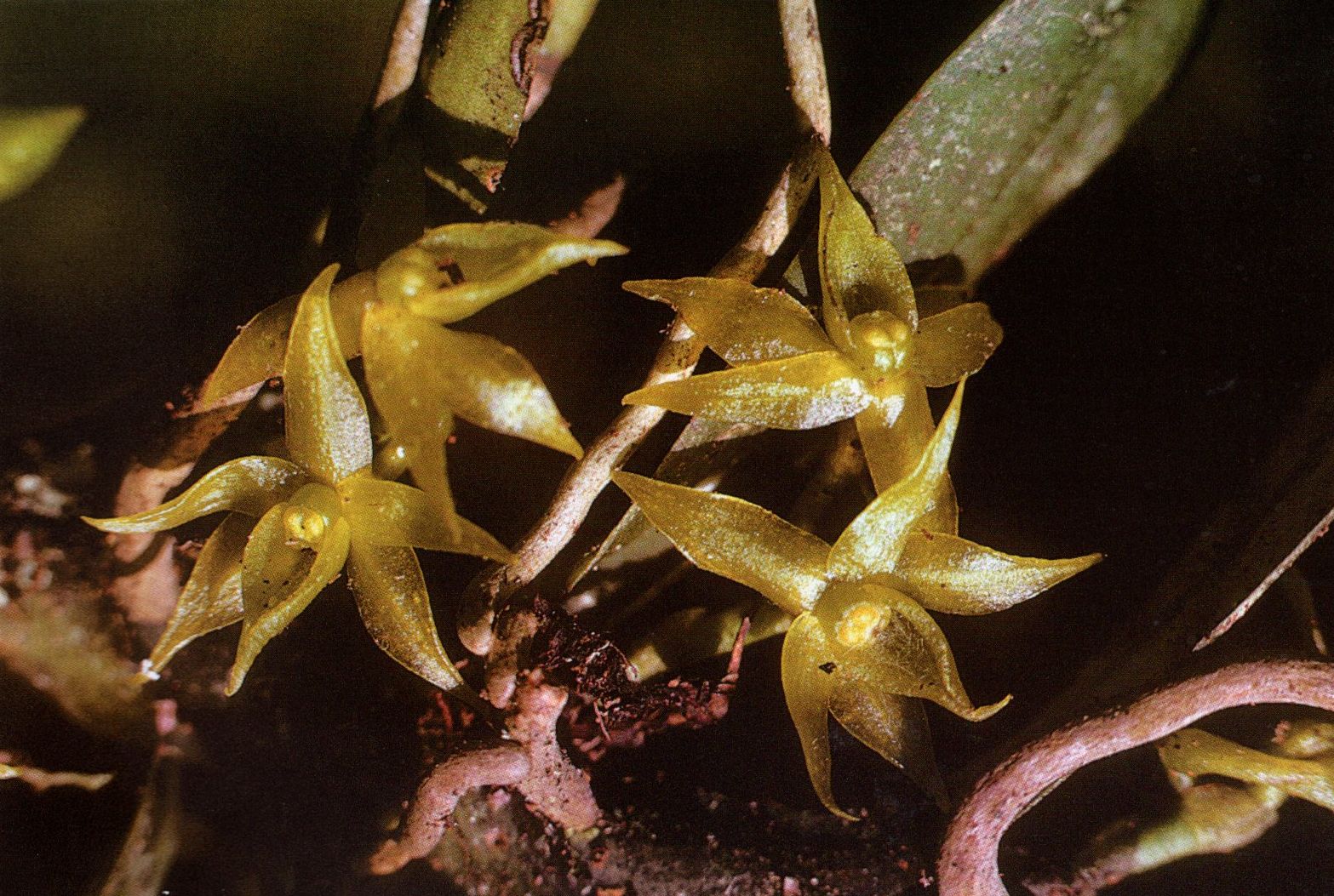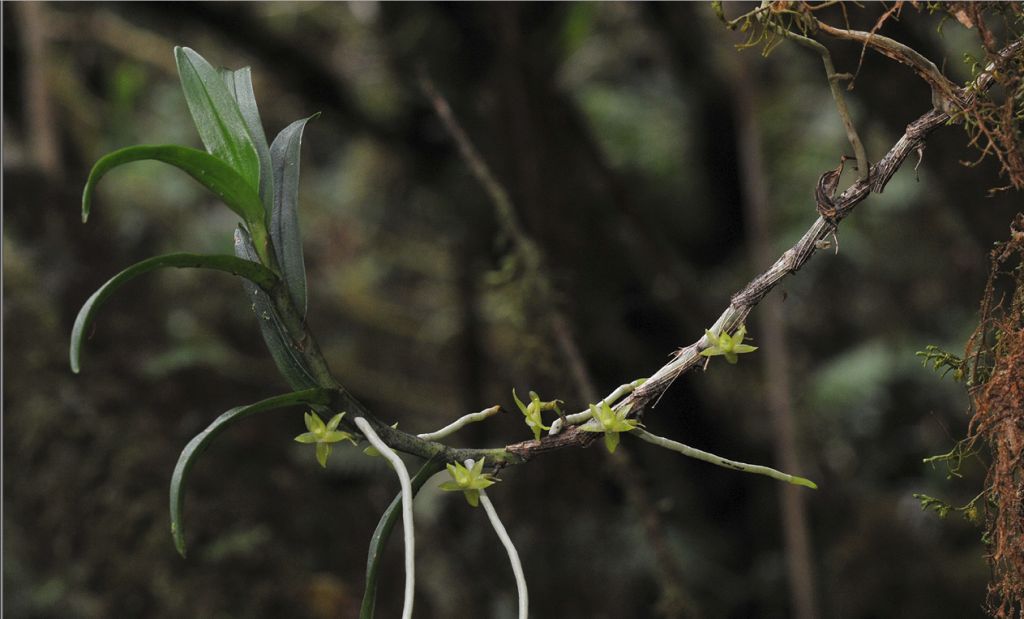 Found in central Madagascar and Reunion Island? in shady forests at elevations around 1100 to 1300 meters as a medium sized, cool growing epiphyte with long, woody stem with many adventitious roots in the lower half and loses ts leaves in the same area and carrying many, .4 to .8" [1 to 2 cm] between each leaf, leaf sheaths keeled, ligulate, flat, dull green, narrowing slightly towards the base, unequally bilobed apically leaves that blooms in the winter and spring on a solitary or appearing more than once from the same point on the stem, shorter than the leaves, 1.2 to 1.6" [3 to 4 cm] long, 1 to 2 flowered inflorescence with boat-shaped, compressed, shorter than the ovary floral bracts and carrying fleshy, green flowers